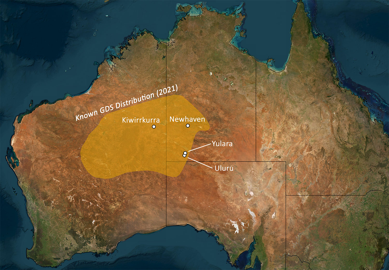 In a recent paper, researchers from the NESP Resilient Landscapes Hub analysed 23 years of data on tjakuṟa burrows (from 2002 to 2023) collected from Yulara, Uluṟu–Kata Tjuṯa National Park and Newhaven Wildlife Sanctuary in the Northern Territory, and Kiwirrkurra Indigenous Protected Area in Western Australia. They assessed how rainfall, vegetation health, time since fire and fire extent affected the number of burrows actively used by tjakuṟa in each area.